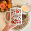 La ghirlanda presenta motivi autunnali come foglie, zucche e colori caldi che evocano l’atmosfera accogliente della stagione.