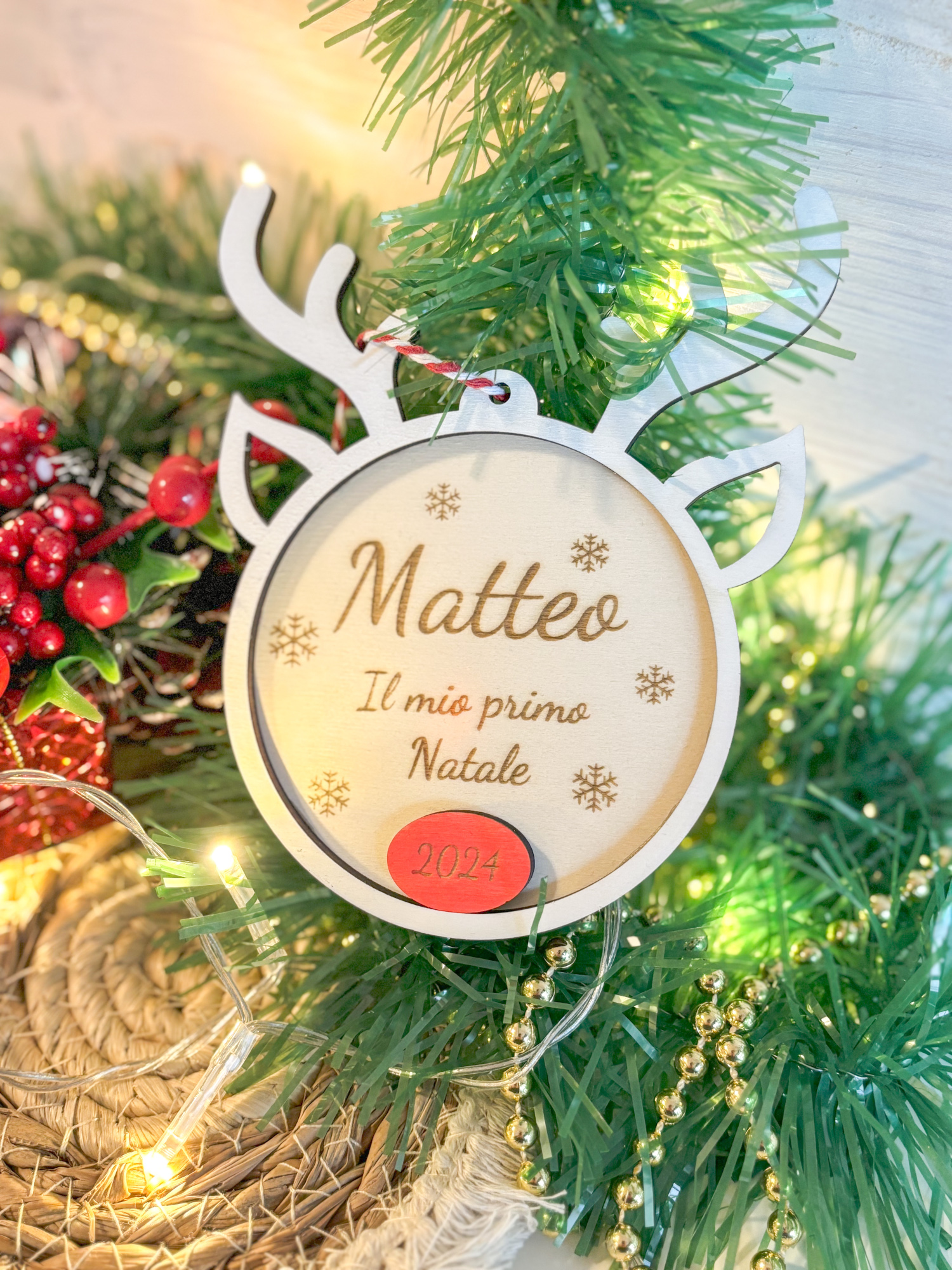 Celebra il primo Natale del tuo piccolo con una pallina di Natale speciale! Realizzata in legno naturale, questa pallina a forma di renna è decorata con il nome inciso del bambino, rendendola un ricordo unico e prezioso. Perfetta per dare un tocco di magia e personalità all’albero, questa decorazione è pensata per durare nel tempo e diventare parte delle tradizioni di famiglia. Un regalo originale e dolce, creato artigianalmente con cura e amore per celebrare un momento indimenticabile.