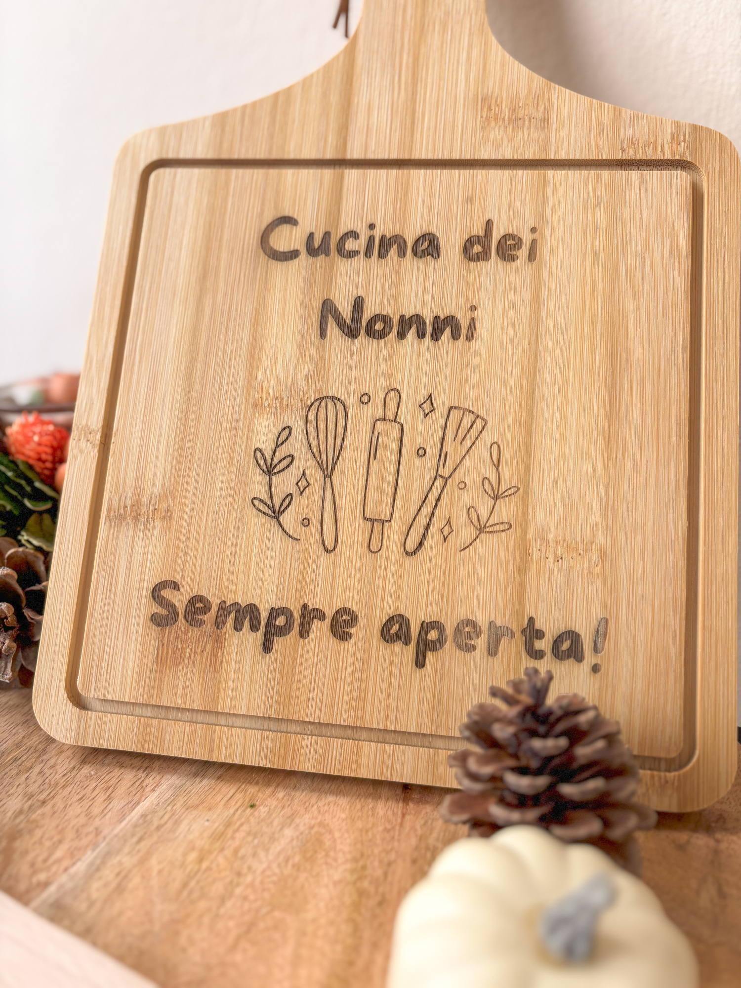 Cerchi un regalo utile e speciale per la Festa dei Nonni? Il nostro tagliere personalizzato con mestoli incisi è la scelta perfetta! Realizzati in legno di alta qualità, questi utensili da cucina uniscono funzionalità e design unico, rendendoli un regalo indimenticabile.
